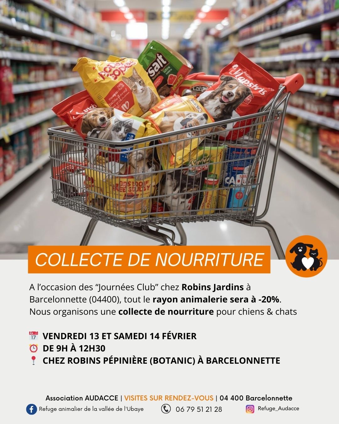 Une grande collecte de nourriture pour les animaux du refuge de la Vallée de l’Ubaye. Le rendez-vous est donné ce vendredi et ce samedi, de 9h00 à 12h30 chez Robins Pépinière à Barcelonnette. L’occasion de soutenir la cause animale.
