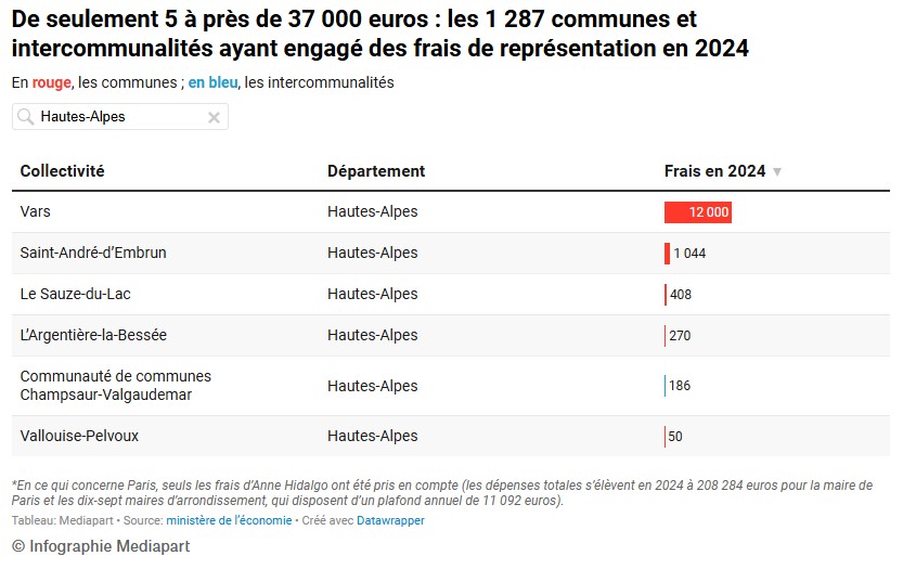 Selon l’enquête publiée par Médiapart, le maire de Vars a utilisé plus que quiconque sur les Hautes-Alpes, les frais de représentation. Aucun frais mentionné pour Gap, pour Briançon ou pour Embrun sur cette colonne de dépenses, selon les chiffres du ministère de l’Economie utilisés pour l’enquête.