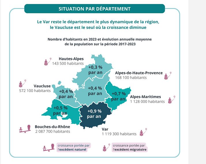 Nos départements qui sont toutefois ceux de la Région Sud qui gagnent le moins d'habitants, avec le Vaucluse, alors que le Var est le Département le plus dynamique.